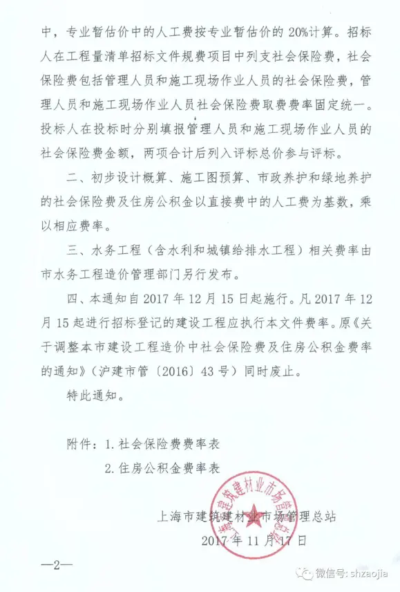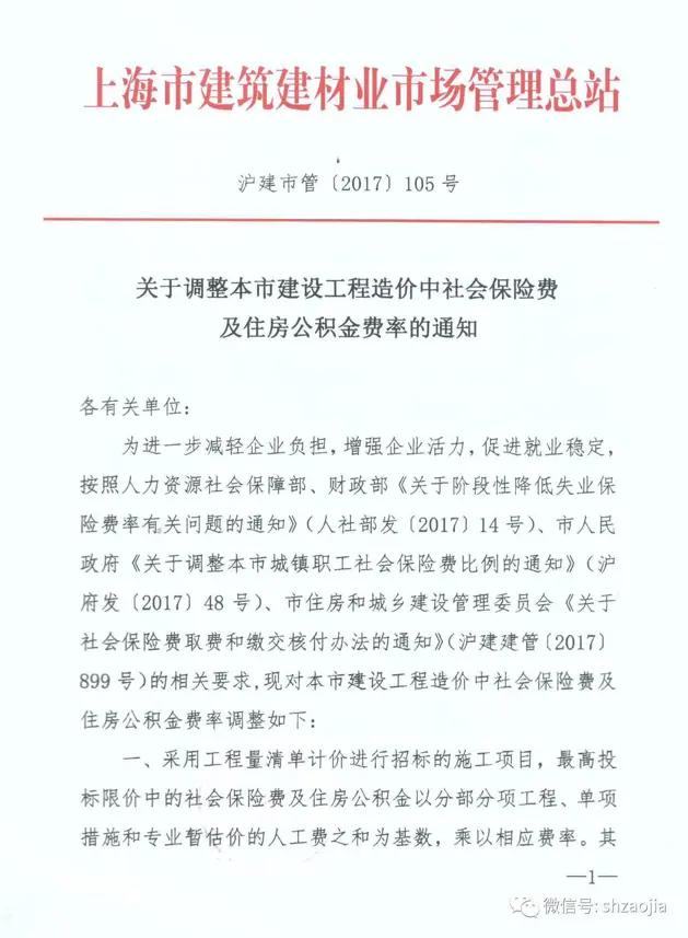 关于调整本市建设工程造价中社会保险费及住房公积金费率的通知(沪建市管[2017]105号)