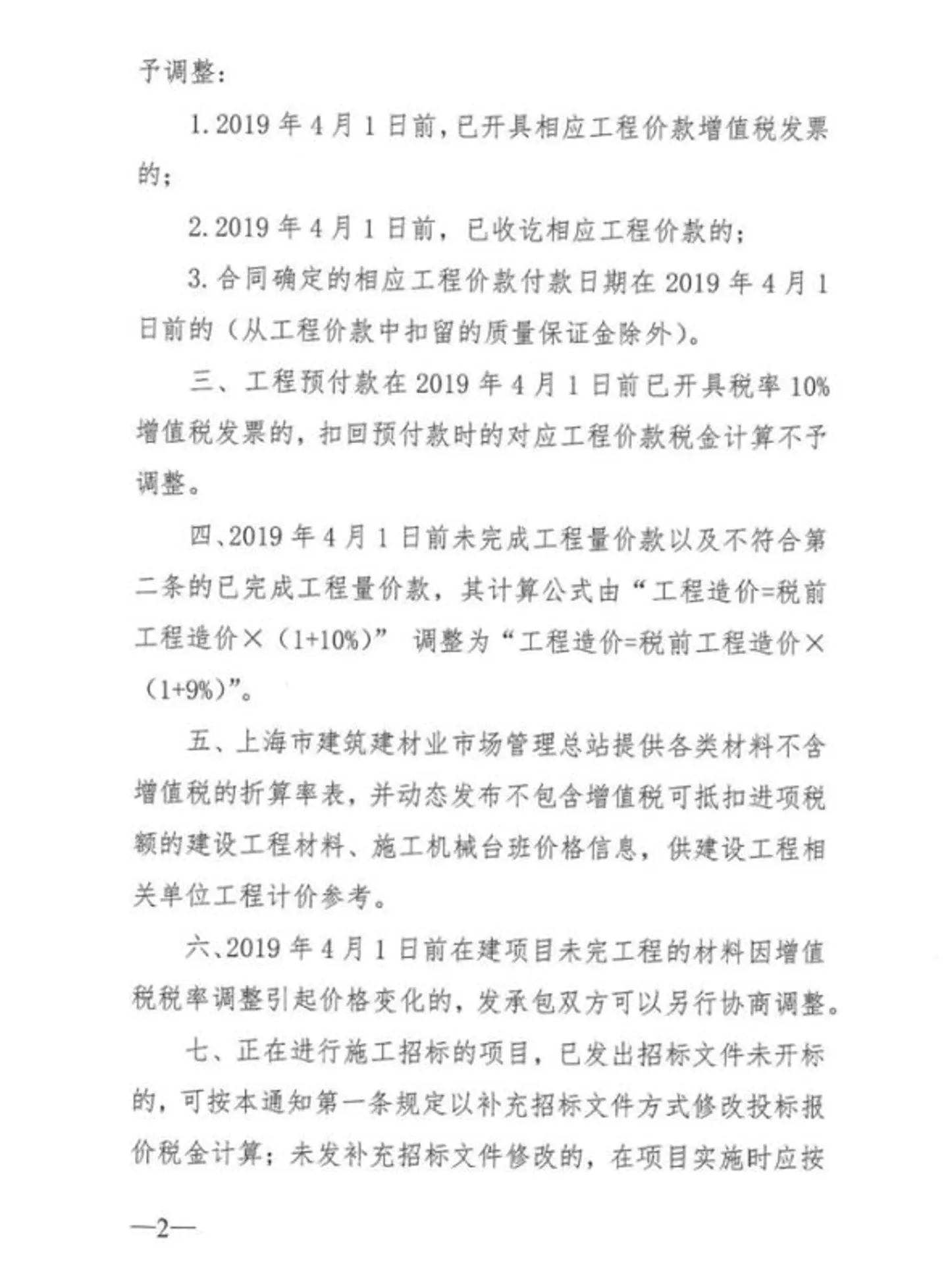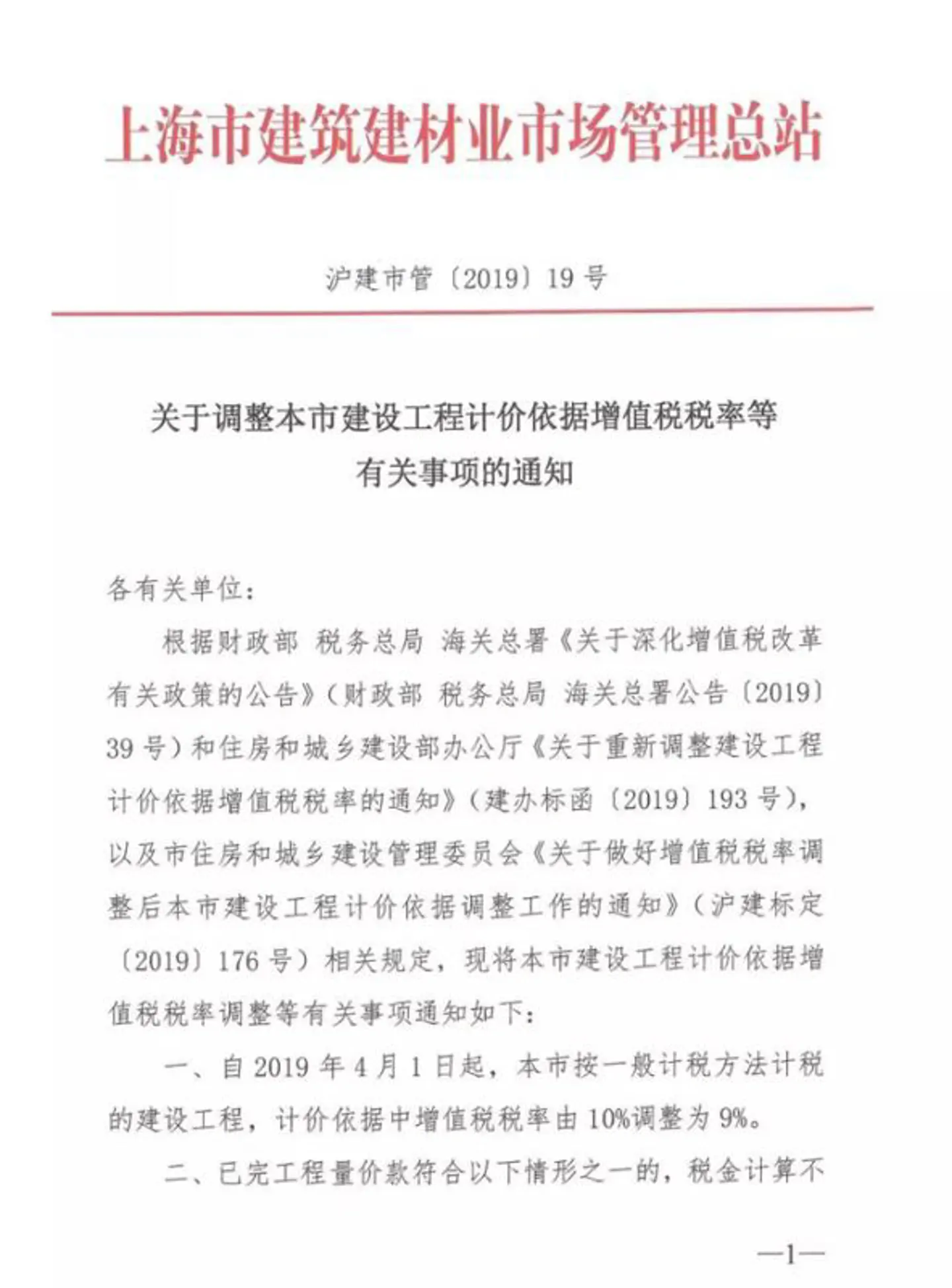关于调整上海市建设工程计价依据增值税税率等有关事项的通知 (沪建市管[2019]19号)